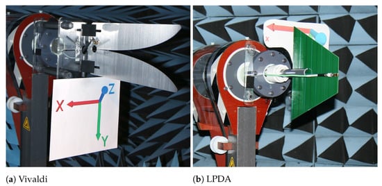 Two antennas were selected. The first one covers the L, C and X-bands, and consists of a wide-band Vivaldi tapered slot aluminum antenna and can be seen in Figure 3a. It covers the full range between 675 MHz and 11 GHz. The second antenna, which covers the P-band and is implemented on a PCB substrate, is a log-periodic antenna covering the 400 MHz– 1000 MHz range. This antenna is shown in Figure 3b.