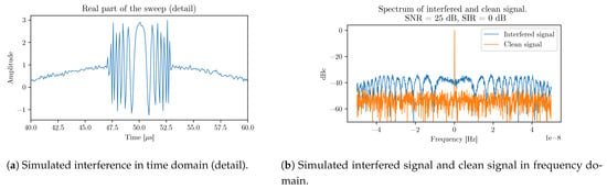 As can be seen in Figure 5b, the degradation of the noise floor is notable. The interference power cannot be reduced by coherent averaging, such as white Gaussian noise (WGN), because the interference is coherent along sweeps. A possible alternative to reduce the interference power would be to use a sweep spanning only a portion of the upper or lower side-band. This option has the drawback of reducing the range resolution. In order to avoid the degradation in range resolution, an alternative method that preserves the bandwidth has been implemented. This method consists of a model-based extrapolation of the beat frequencies in the STFT domain. The method description and implementation is presented in Neemat [34]. The spur seen in Figure 5a is zeroed and the missing data segment is filled with interpolated data, following a model of the FMCW radar signal. An advantage of this method is that the spur is eliminated completely while avoiding the side-lobe level degradation that would appear by only blanking the spur.
