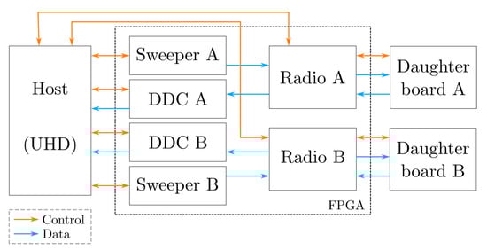 The high level implementation of the digital radar core can be seen in Figure 6 and is implemented on top of an RF Network-on-Chip (RFNoC) architecture in the SDR FPGA. The radar core consists of two sweep generators implemented via RAM block signal players, which are programmed by the host. The transmitted signal is generated at full rate and sent directly to the radio core block, which is in charge of signal transmission and reception to and from the SDR daughter-boards. The deramped signal is sampled at full rate and is filtered and decimated by a DDC block. The output of the DDC block is connected to a stream endpoint which sends the data to the host computer.