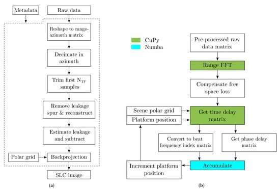 (a) Raw data to Single Look Complex image. (b) Schematic representation of the backprojection algorithm. Green blocks are accelerated with a GPU, while the blue block is pre-compiled and parallelized in the CPU.