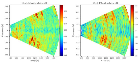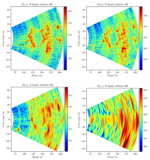 The logarithmic power Single Look Complex (SLC) images can be seen in Figure 9. From these, a qualitative assessment can be done about the characteristics of each band. The first effect to note is the evident loss of resolution, which worsens progressively as the frequency decreases. At X- and C-bands, the resolution is high enough to be able to correlate the orthophoto from Figure 8b with the radar images, the buildings and the staggered geometry of the terrain being the most distinctive features. At L-band, this correlation is more difficult to observe, while at P-band the shape of the scene is lost. The second effect to note is the progressive broadening of the illuminated scene, consistent with the broadening of the antenna beam patterns shown in Figure 4b–d. Another relevant aspect is the superior vegetation penetration characteristics in L and P-bands, as can be seen, for example, at coordinates (170,−70). Additionally, a noticeable aspect is the dimming of the reflector as the frequency decreases, an effect of the decrease of the reflector radar cross section (RCS), combined with its smaller contribution within a bigger pixel.