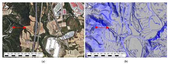 Test site n°3 orthophoto (a) and elevation map (b). The square and arrow indicate the radar position and azimuth view direction. Orthophoto and DEM credit: Institut Cartogràfic i Geològic de Catalunya.