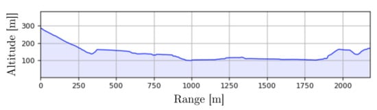 A parameter necessary for the maximum range calculation is the scattering coefficient (), which was set to −25 dB, a value common for relatively smooth surfaces at grazing angles around 30° [31]. Using this relation and the other design parameters, the SNR budget determined that a 10 s acquisition time was sufficient.