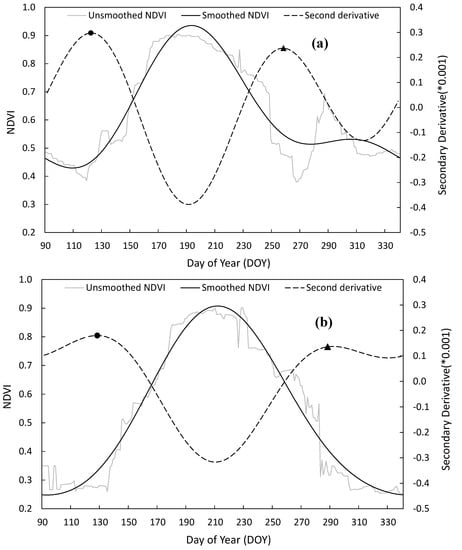 where f’ and f” are the first- and second-order derivatives of the smoothed NDVI time series (f), i is the time sequence number of values in the smoothed NDVI time series (2, 3 …365), 1 is the time step of NDVI time series, and f is the smoothed NDVI time series.