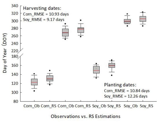 The county-level assessment appeared to show lower accuracies compared to the state-level assessment (Figure 4). Generally, the estimated crop phenological dates were later than those observed from field tests. Overestimations were larger in estimated planting dates than harvesting dates for both corn and soybean. The RMSE values of corn planting and harvesting dates were 10.84 and 10.93 days, respectively. For soybean, the RMSE of harvesting dates was 9.17 days, and the RMSE value of planting dates was 12.26 days.