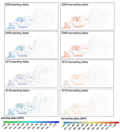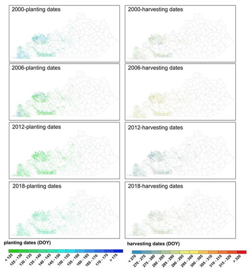 The corn planting and harvesting dates were mapped every six years from 2000 to 2018 in Kentucky (Figure 5). The corn cultivation areas were mainly distributed in western Kentucky. The corn planting dates showed obvious spatial differences in 2000 and 2006, but not during 2012 and 2018. In general, the earliest and latest planting dates were appeared in 2012 and 2000, respectively. Unlike the distribution of planting season, the timing of corn harvesting dates varied widely among different pixels during four years. The earliest and latest corn harvesting dates were detected in 2012 and 2006, respectively. Moreover, the earlier planting dates accordingly led to earlier harvesting dates in 2012.