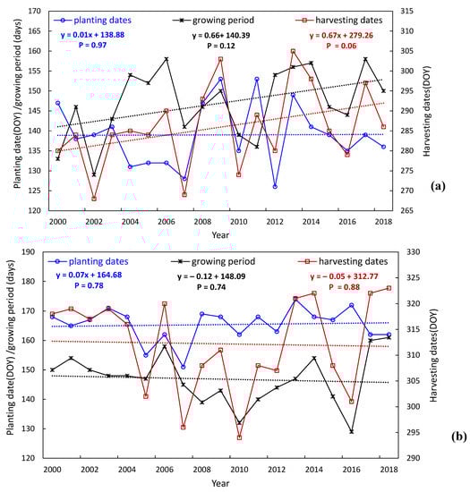 Many studies have shown that the climate impacts on agricultural ecosystems are reflected by variations in crop phenology, such as the advanced or delayed planting and harvesting dates [,,]. For example, He et al. [] reported that soybean planting dates were delayed by an average of 1.78 days/decade, and the growing season length was shortened by an average of 1.16 days/decade during 1981–2010 across the major soybean-producing areas in China. Climate warming is a primary factor that drives phenological shifts [], with temperature responses varying with crop types, locations, and study periods [,]. Many studies have investigated the responses of crop phenology to historical climate warming at regional to global scales. For example, Estrella et al. [] reported that corn and oats sowing dates in Germany advanced in response to increases in March–May temperature at a rate of 0.60 days/°C and 4.15 days/°C, respectively. Based on corn phenology observations collected from agro-meteorological stations in China, Tao et al. [] reported that the growing season lengthened during 1981–2009 due to combined effects of warming temperature, changing field practices, and shifting varieties. Model simulation results from Tubiello et al. [] have shown that warmer temperatures accelerated plant phenology and further shortened the crop growing period, which resulted in crop yield reduction and potential food insecurity. Nevertheless, other climatic factors such as precipitation could determine the planting date more directly than the temperature in some regions [,]; however, few studies have explored the crop phenological changes and their relations with precipitation.