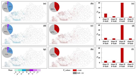 Slope, p values, and their percentages of planting dates (a–c) harvesting dates (d–f) and growing season length (g–i) of corn in Kentucky, 2000–2018 (Slope: change rate of crop phenological dates; p values: the confidence of trend analysis; we only included pixels that were identified as corn for more than 12 years in the Mann-Kendall statistical test).