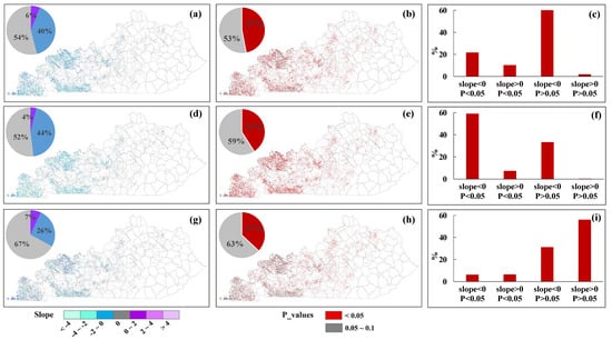 Slope, p values, and their percentages of planting dates (a–c) harvesting dates (d–f) and growing season length (g–i) of soybean in Kentucky, 2000–2018 (Slope: change rate of crop phenological dates; p values: the confidence of trend analysis; we only included pixels that were identified as soybean for more than 12 years in the Mann-Kendall statistical test).