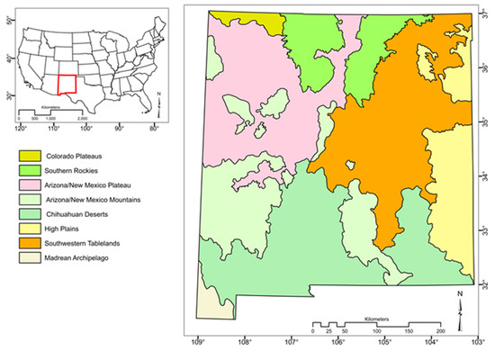 A map showing the location of the New Mexico, the contiguous USA (red polygon), and the nine ecoregions within New Mexico [41].