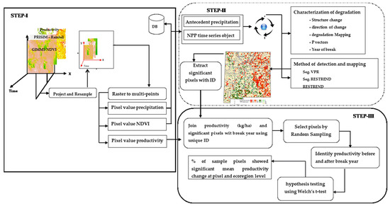 The TSS-RESTREND method by [8] provided only a qualitative assessment of breakpoints with other independent data in terms of significance and direction of changes. These two properties are important to properly characterize changes in productivity. A framework was developed in this study to address this gap by proposed means to quantitatively assess these properties. This framework consisted of four steps: (1) Develop random samples within the identified significant breakpoints; (2) Select and use independent productivity data; (3) Evaluate the random samples at the pixel level; and (4) Group and evaluate all random samples that fall within identified ecoregions—allowing to identify whether the changes in productivity at the individual pixels are reflective of consistent regional changes.