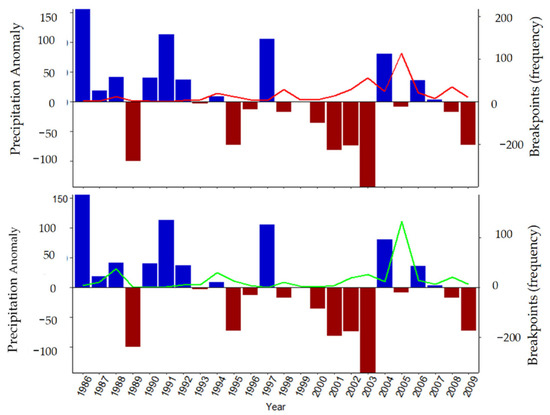 A summary of the number of detected significant breakpoints along with corresponding precipitation anomaly (mm) based on a 33 year mean from PRISM. Top and bottom panels show pixels with decreasing (red line) and increasing (green line) trends in productivity, respectively.