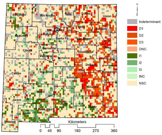 The number of significant breakpoints detected (increased and decreased productivity) and precipitation anomalies between 1982 and 2015 were shown in Figure 3. Out of all the analyzed pixels (i.e., 4454), 814 (18.3% or ~50,000 km2) had significant breakpoints—with either increasing or decreasing trends—were detected over different land cover types. The remaining pixels that showed insignificant change (NSC), indeterminant, or identified as Agricultural represented about 55.6% (158,591 km2), 10.8% (30,656 km2) and 3.2% (9122 km2) of NM’s area (~315,900 km2). The distribution of these pixels is shown in Figure 4. Out of the 814 significant breakpoints, 52.3% (26,176 km2) and 46.5% (23,232 km2) had negative (decreasing) and positive (increasing) change in productivity, respectively (Table 2). The areas that showed significant increasing trends in productivity as I1, I2 and I3 were about 10,752 km2 (3.8%), 9408 km2 (3.3%), and 3072 km2 (1.1%) respectively. The areas that showed decreasing trend in productivity with D1, D2, and D3 level of significance were about 9088 km2 (3.2%), 13,056 km2 (4.6%), and 3776 km2 (1.3%), respectively.