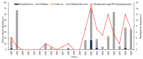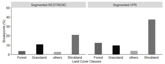 From all obtained 814 significant breakpoints, 62.7% and 37.3% were identified using Segmented VPR and Segmented RESTREND methods, respectively. From those identified by Segmented RESTREND method, 20.8%, 10.5%, 3.4%, and 2.6% were over shrubland, grassland, evergreen forest, and other land cover classes, respectively. From those identified by Segmented VPR method, 37.3%, 12.3%, 9.5%, and 3.6% were over shrubland, evergreen forest, grassland, and other land cover classes, respectively.