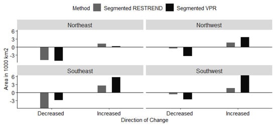 From all analyzed pixels (i.e., 4454 pixels), the ones that showed increasing trends in productivity based on the Segmented VPR method (i.e., 5.7% or ~16,320 km2) were detected mostly in the southwestern (2.27%~6464 km2), southeastern (2%~5824 km2), and northwestern (1.3%~3712 km2) quadrants (Figure 6). Furthermore, 2.51% of the pixels (7168 km2) revealed reversal from degradation—increased productivity based on the Segmented RESTREND method (Figure 6). From which, 0.45% and 0.92% were in the northeastern and southeastern quadrants, respectively (Figure 6). The largest number of pixels that showed NSC was detected in northwestern (46,144 km2), while southeastern quadrant exhibited the least (32,256 km2~11.1%). Northeastern (40,896 km2) and southwestern (39,296 km2) NM revealed an equal number of NSC pixels during the study period.