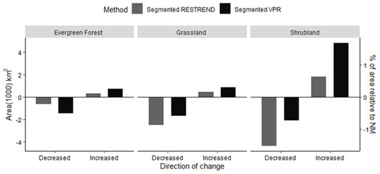 Area and direction of change in productivity in grasslands, shrublands, and evergreen forests in New Mexico as identified using the Segmented VPR (degraded vegetation or gradual increase) and Segmented RESTREND (reversal and initiation of degradation) methods.