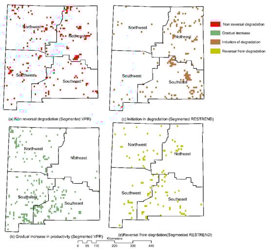 Direction of change in productivity in New Mexico’s quadrants during the 1982–2015 period indicating (a) non reversal degradation, (b) gradual increase, (c) initiation of degradation, and (d) initiation of reversal from degradation along with the corresponding methods used.