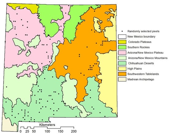 NM’s land cover encompasses nine ecoregions that include the Chihuahua Deserts (22%) in south, southwestern part of NM, Southwestern Tablelands (22%) and Western High Plains (10%) in central, West and in the northwest parts of NM, Arizona/New Mexico Mountains (14%), Arizona/New Mexico Plateau (19%), Madrean Archipelago and southern Rockies [41] (Figure 1). Three major types of vegetation biomes (i.e., forest, shrubland and grassland) comprise the respective ecoregions [42].