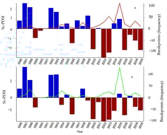 From all significant breakpoints, 58%, 20%, and 15.7% were observed in shrubland, grassland, and evergreen forest ecosystems, respectively (Figure 5). The highest number of detected breakpoints was 250 (or 31% out of 814) in 2005. Among them, shrublands and grasslands combined accounted for 87.6% (219), out of which 72.8% and 14.8% were over shrublands and grasslands, respectively.