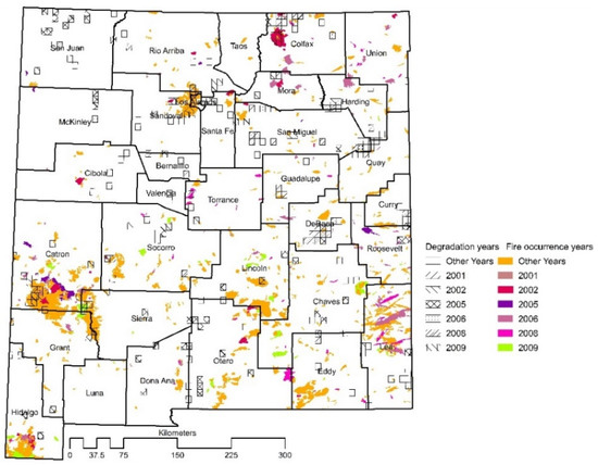 Gridded precipitation data developed by Parameter-elevation Regressions on Independent Slopes Model (PRISM) was obtained from PRISM Climate Group [46]. Monthly precipitation at ~4 km pixels was used. To evaluate the accuracy of breakpoints in terms of timing, extent, and direction of change relative to potential disturbances, historical drought and fire events were compared with the breakpoints. Mean monthly and annual self-calibrated Palmar Drought Severity Index (PDSI) was acquired from [47]. Fire data were obtained from New Mexico Resources Geographic Information System (RGIS) [48].