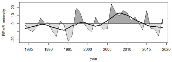 The BFAST method was applied on the ctsVPR-residual to list potential breakpoints. Briefly, the BFAST method decomposes the timeseries into season, trend, and reminder components—an approach that allows to detect changes in the season and trend components [52,53]. The list of potential breakpoints identified by the BFAST method [8] based on the ctsVPR-Residuals were further evaluated for their significance in the VPR—allowing to assess their impact on NPP as represented by the maximum NDVI timeseries. A Chow test was applied on the VPR-Residuals on all pixels with significant VPR (α = 0.05). Based on this test, all pixels that have no significant breakpoints in the VPR-Residual (α = 0.05) but have significant VPR (α = 0.05) were further assessed using the standard RESTREND by developing a regression between the VPR-Residuals and time (Equation (1)) [8].