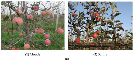 In the study, fruits in Fuji apple trees of fusiform cultivation mode in a modern standard orchard were used as research object, and the original images of apple trees from the standardized modern orchard in Agricultural Science and Technology Experimental Demonstration Base of Qian County in Shaanxi Province and the Apple Experimental Station of Northwest A&F University in Baishui county of Shaanxi Province were collected. In fusiform cultivation mode, the row spacing of apple trees is about 4 m. The plant spacing is about 1.2 m, and the tree height is about 3.5 m, which is suitable for apple picking robot to operate in the orchard. The images of apple trees were obtained on sunny and cloudy days. The shooting phase included morning, noon and afternoon. The images were captured by Canon Powershot G16 camera, with a variety of angles selected for image acquisition at different shooting distances (0.5–1.5 m), and in total, 1214 apple images were obtained, including the following conditions: apples occluded by leaves, apples occluded by branches, mixed occlusion, overlap between apples, natural light angle, backlight angle, and side light angle, etc. (Figure 2). Furthermore, the environment factors such as cloudy, shadows, high light, low light, reflections were also considered in image capture. The resolution of the captured images is 4000 × 3000 pixels, and the format is JPEG.