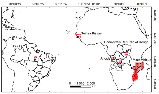 Location of the study areas, in red, in Brazil (Br2), Guinea-Bissau (Gw2, Gw10, IM-3, IM-10), Democratic Republic of Congo (Cd2), Angola (Ao2, Ao8), and Mozambique (Mz6) in South America and Africa continent.