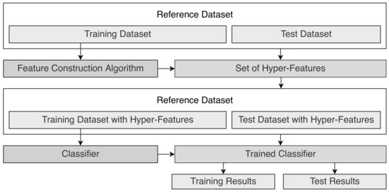 The core of this work is to expand the reference datasets with hyperfeatures that improve the performance of different ML methods. Figure 2 illustrates the process of obtaining and using such hyperfeatures. As usual, the reference dataset is split in two datasets, one for training the classifiers, called the training set, and one for testing the classifiers on unseen data, called the test set. Based only on the training set, the feature construction algorithm creates a set of hyperfeatures that are used to expand the reference dataset in both training and test sets. The expanded training set is used by the classification algorithm to obtain a trained classifier that is applied to both (expanded) training and test sets in order to report the performance in terms of learning and generalization, respectively.