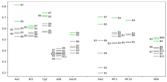Regarding the popularity of the different satellite bands in the evolved hyperfeatures, Figure 5 shows, for each band and each dataset, the fraction of hyperfeatures generated for that dataset (in 30 runs) that use the band. We only check whether a band appears in a hyperfeature. Measuring its importance inside the hyperfeature would be a complex exercise that we do not perform here. For each dataset, we subjectively identify a group of most popular bands as the ones ranked higher and at a larger distance from the rest. We do not identify any popular bands for Ao8, since on this dataset all the bands are ranked low, with small distances between them.