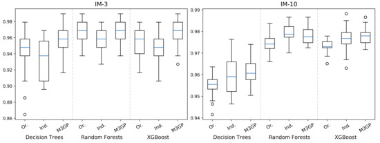 Although we use M3GP as a feature construction method for other ML algorithms, M3GP can perform binary and multiclass classification by itself, as described in Section 3.4. While using M3GP to evolve the hyperfeatures, we have registered the accuracy values it achieved in each dataset, presented in Table 4. Although the accuracy is high, it is generally worse than the accuracy achieved by the other ML algorithms we used, and therefore we will not refer to the results of standalone M3GP again.
