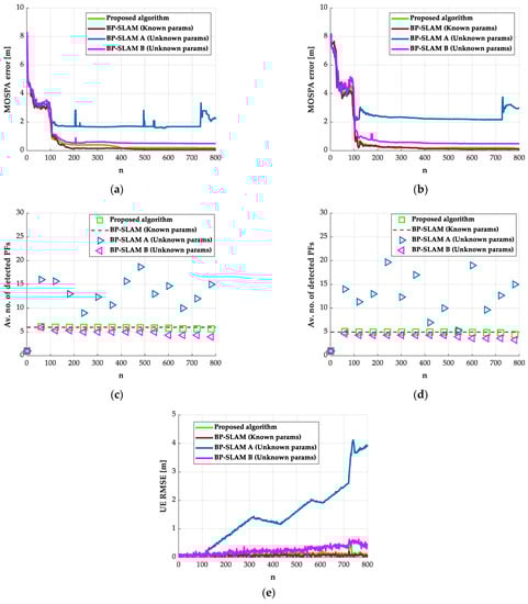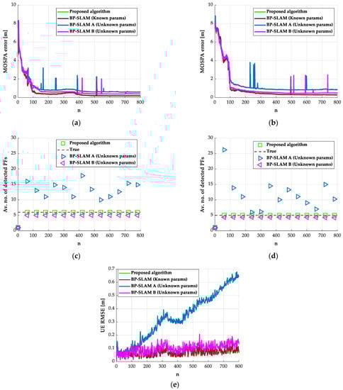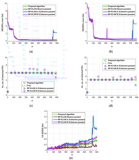 Figure 4 illustrates the simulation results of the proposed algorithm in the second scenario, which are also obtained based on the average of 100 simulation runs. Figure 4a,b show the MOSPA errors for PT1 and PT2 and their associated VTs, respectively. From Figure 4a, we see that the MOSPA errors of the four algorithms for PT1 all have a decreasing trend and finally reach steady states. The MOSPA errors for PT1 and the associated VTs of BP-SLAM A and BP-SLAM B converge at approximately 0.6 m and 0.4 m, respectively, while the performance of the proposed algorithm is better, converging near 0.2 m, which is close to the result of the BP-SLAM algorithm with known parameters. The results in Figure 4b are similar to those of Figure 4a. When the MOSPA error of the four algorithms becomes steady, the MOSPA error of the proposed algorithm is significantly smaller than that of BP-SLAM A and BP-SLAM B. Figure 4c,d describe the average number of detected PFs associated with PT1 and PT2 every 60 s, respectively. These two figures show that the average numbers of detected PFs by the proposed algorithm converge to the true values within 60 s, while the numbers of detected PFs by BP-SLAM A are always in a disordered state. Meanwhile, although the results for BP-SLAM B are convergent, they converge to the wrong number. Figure 4e depicts the UE position RMSEs for the four algorithms. Figure 4e shows that the position accuracy of the proposed algorithm is significantly better than that of BP-SLAM A and BP-SLAM B. During the simulation run time of 800 s, the RMSE of the proposed algorithm is always lower than 0.15 m, which is close to the performance of the BP-SLAM algorithm with known parameters. However, the UE position RMSE of BP-SLAM A increases rapidly in 800 s, and the maximum is more than 0.65 m. Although the performance of BP-SLAM B is relatively good, its position accuracy is lower than that of the proposed algorithm all the time.