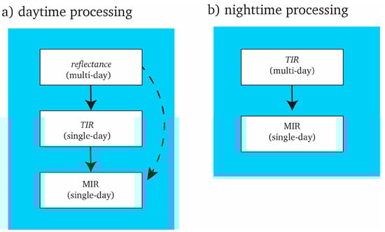 “Day” or “night” categories are assigned using reflectance data. Active fire algorithms use different equations for daytime and night-time [13,14]. The real-time BRIGHT algorithm defines the day or night period using reflectance data. The geographic region of interest is defined as a box that encapsulates all pixels, plus the surrounding 50 pixels. If any row of reflectance data (within the box) has more than nine invalid pixels, the region is assigned to the “night” category. Otherwise, the region is assigned to the “day” category. While day/night assignments may be more robust using solar zenith angle, the method described was chosen due to the speed of processing to enable faster delivery of active fire information to resource managers. Once the day/night assignment is complete, data are then collected as follows.