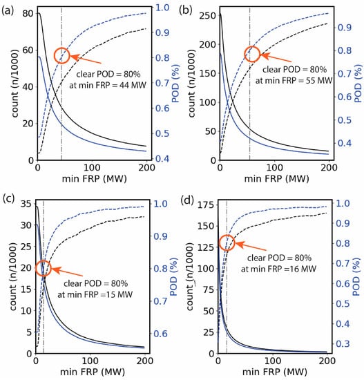 (a) BRIGHT-to-MODIS (MODIS) and BRIGHT-to-VIIRS (VIIRS) raw counts and POD values analyzed by minimum MODIS and VIIRS FRP value. Minimum FRP versus raw count (solid line) and minimum FRP versus probability of detection (dashed line, axis on right) for all MODIS daytime hotspots (black) and for the subset of “clear” values having a valid BRIGHT threshold (blue). (b–d) are the same except for VIIRS-day, MODIS-night, and VIIRS-night. The grey dash-dot line shows the FRP value above which the “clear” POD is greater than 80%, with the actual values annotated. Note that the x-axis has been artificially cut-off at 200 MW for demonstration purposes.