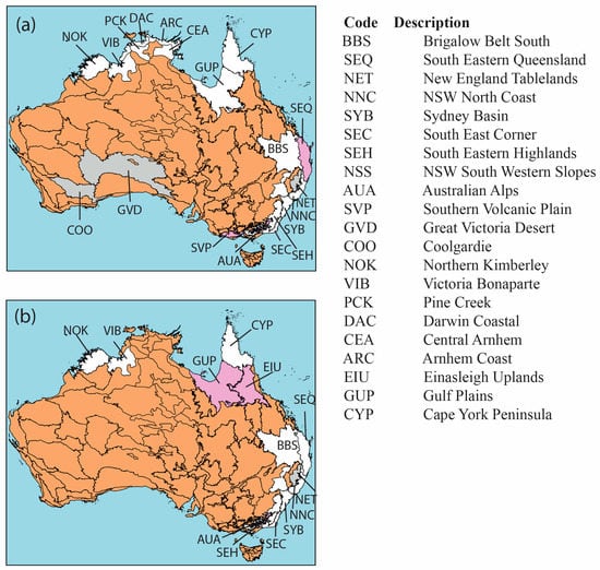 - Australia, E. Revision of the Interim Biogeographic Regionalisation of Australia (IBRA) and the Development of Version 5.1—Summary Report; Department of Environment and Heritage: Canberra, Australia, 2000. [Google Scholar]