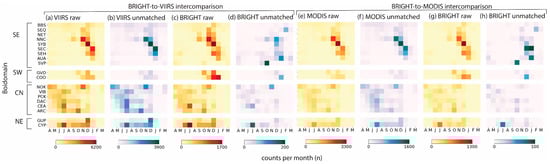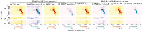 Daytime counts per month per biodomain. Shown are biodomains that contain either 50% of the raw fire activity or 50% of the unmatched fire activity; in southeast (SE), southwest (SW), central-north (CN), and northeast (NE) groupings. Note the different ranges on the color-bars. Raw and unmatched counts are shown for the BRIGHT-to-VIIRS and BRIGHT-to-MODIS intercomparisons, labels as marked. For a description and the location of each bidomain, see Figure 6.