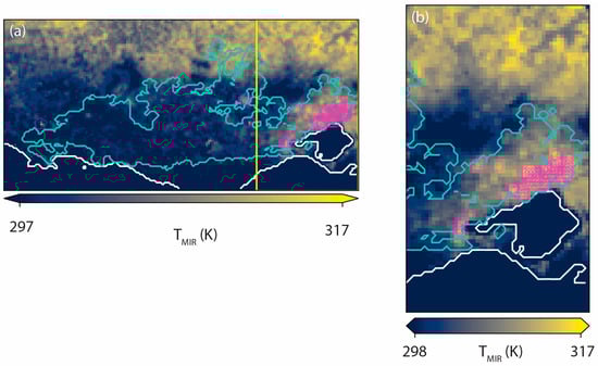 The pixel size of satellite observations impact the fire brightness temperatures recorded and are linked to the fire size and intensity, which are can be retrieved through fire detection algorithms. Current variations in pixel sizes (such as (at ~4 µm) AHI/Himawari-8 2 km, MODIS/Terra 1 km and VIIRS/Suomi-NPP 375 m resolution) mean that fire brightness temperature will differ between satellite and instrument combinations. For example, for MIR readings below 350 K in [13,14], fires were detected using statistics, with potential fire pixels compared to samples of data. Data samples typically need to be fire-free for statistically-based fire detection algorithms as samples derived from fire-affected data may cause missed detections. Data samples also typically need to be cloud-free as clouds can block outgoing radiation, reflect sunlight, and/or artificially lower statistics [1]. Cloud detection algorithms are also sensitive to pixel size [35], and gross checks for fire and/or cloud in data samples are likely to degrade with increases in satellite pixel size. Hence, the quality of ancillary information such as cloud masks (and coarse fire thresholds) can impact the design of fire algorithms, with workarounds required when they are not available [32,34].