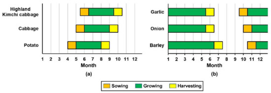 Figure 3 shows the phenological stages of crops in the two study areas obtained by field surveys. In Anbandegi (Figure 3a), all crops are grown in Anbandegi during the normal growth period for summer crops but have different sowing and harvesting times at intervals of approximately two weeks to one month. Highland Kimchi cabbage is sown later than cabbage and potato and is harvested in mid-September. Potato and cabbage were sown in early June, but the harvesting time of potato was faster than that of cabbage (mid-August). All crops in Hapcheon are sown from the fall of the previous year (Figure 3b). Onion and garlic are managed by plastic mulching for winter protection until mid-March. Thus, the growing stages of onion and garlic can be monitored from the end of March or early April.