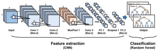 The CNN-RF model shares the network structure of the CNN model, but some parameters must be adjusted prior to the RF-based classification. As features extracted from the fully connected layer are used as inputs for the RF classifier, mtry and ntree are determined using a grid search procedure similar to that in the RF model. Figure 4 shows the architecture of the CNN-RF model developed in this study.
