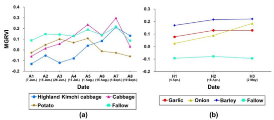 In Hapcheon, the MGRVI values of all the crops increased gradually from April to May, and only slight differences in the variation of MGRVI were observed, except for onion (Figure 6b). Consequently, it may be difficult to discern crops, even if all time-series images are used for the classification. In contrast, it is easy to identify fallow that is consistently managed as bare soil while crops are growing.
