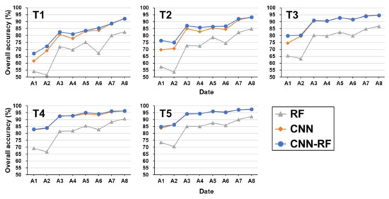 As expected, OA values for all classifiers increased as more input images and training data were used for classification. Using all eight images (A8) and the largest training data (T5) yielded the highest classification accuracy. In this case, both CNN and CNN-RF achieved a similar classification accuracy. For all combination cases, the best and worst classifiers were CNN-RF and RF, respectively. A substantial improvement in the OA of CNN-RF over RF and CNN was obtained when using only one image and two images (A1 and A2) with small training data (T1 and T2) for classification. The maximum increases in the OA of CNN-RF over RF and CNN are 21.3%p for A2 and T2 and 6.7%p for A1 and T2, respectively. Given a much larger number of reference samples (20,000) than the training samples (80 to 1280), the small difference in the OA between CNN-RF and CNN can be considered significant. When accuracy statistics are calculated using large reference samples, even small difference in the OA indicates that the number of correctly classified samples is large. Furthermore, the OA between CNN-RF and CNN for each classification run with respect to the combination cases with limited input data was statistically significant at the 5% significance level from the McNemar test [54].