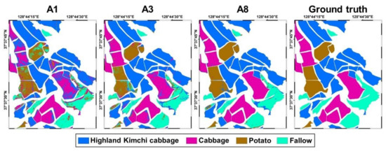 To illustrate the advantage of CNN-RF for early crop mapping, the specific classification results using T2 which showed significant differences in the OA between classifiers, are shown in Figure 11 for visual comparison. Highland Kimchi cabbage fields are properly classified when one image (A1) and three images (A3) are used with small training samples, except for certain isolated pixels at field boundaries. However, most cabbage and potato fields are misclassified when only one image (A1) is used as the input. As the sowing time of cabbage and potato is early June, using a single June image is not adequate for their discrimination. Conversely, adding more images acquired until the end of June (A1 to A3) substantially reduced the misclassified pixels in cabbage and potato fields. Although noise effects still exist, the overall classification result using A3 is similar to that using all eight images (A8), thus demonstrating the benefit of CNN-RF for early crop mapping.