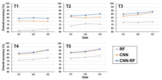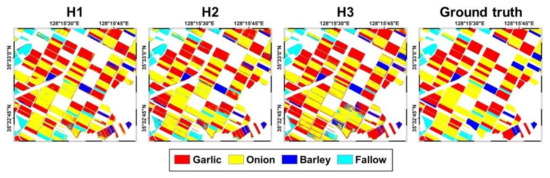 Figure 14 shows the incremental classification results of CNN-RF with T1 for different input images. Considering the difficulty in collecting training samples, T1 (the smallest training samples) was selected for the visual comparison. The confusion between garlic and barley is observed for all classification results. When using only one image (H1), the misclassification of barley occurs more in the classification result; however, other crops are well identified, compared with the classification results using more images. As the major crop types in the study area are onion and garlic, it can be concluded that CNN-RF can generate reliable classification results in Hapcheon even with limited inputs for early crop mapping (T1 and H1).
