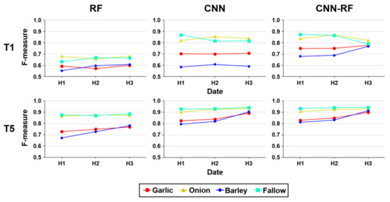 The variations in the class-wise F-measure for the two different training data sizes (T1 and T5) are shown in Figure 13. In the case of T1 (smallest training samples), the F-measure values for garlic and barley were lower than those for onion for all three classifiers. In particular, the F-measure of barley for RF and CNN was very low when using H1. Using more images did not improve the accuracy of barley. The low accuracy for garlic and barely is mainly due to the spectral similarity in Figure 6b and the low class separability in Figure 8. The F-measure of barley for CNN-RF was not high (0.68) in the case of T1, but CNN-RF increased the F-measure by approximately 9.6%p, compared with that for CNN. Furthermore, CNN-RF increased the F-measure for garlic when all three images were used. The accuracy of onion and fallow for H3 was lower than that for H2 because of the confusion between the two crops (1.9%p and 2.6%p lower for onion and fallow, respectively), but the OA of CNN-RF was still 4.2%p higher than that of CNN (Figure 12).
