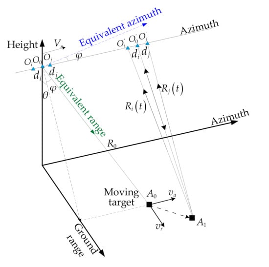 Here, the line of radar sight is defined as equivalent range direction and the corresponding perpendicular direction is equivalent azimuth direction, as shown by the green line and blue line in Figure 2, along which the velocity is and respectively.