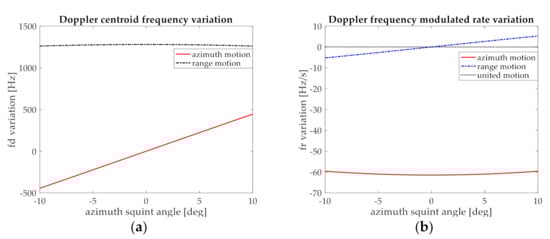 For simplicity and without affecting the subsequent analysis, the Doppler spectrum shifts caused by target motion and CEPC interval are ignored in Equations (7c), (8b) and (8c), whose values are very close to zero. Consequently, the variation of and caused by target azimuth and range motion can be analyzed individually based on Equations (7) and (8). Figure 3 shows these variations with different azimuth squint angles, using parameters listed in Table 1.