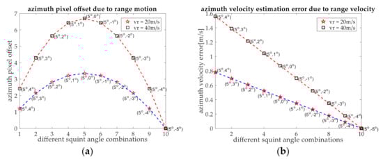 However, if the absolute values of squint angles are not equal to each other, the azimuth velocity estimation error caused by target range motion cannot be ignored as shown in Figure 4, with parameters listed in Table 1. In Figure 4a, the azimuth pixel offset with different combinations of squint angles is given, on the condition of target range motion 20 m/s and 40 m/s, respectively. As shown, the larger the difference in the absolute value of squint angle is, the larger the azimuth pixel offset becomes. Furthermore, the corresponding azimuth velocity estimation errors caused by range velocity are provided in Figure 4b, which should be considered especially when the absolute values of squint angles are not the same.
