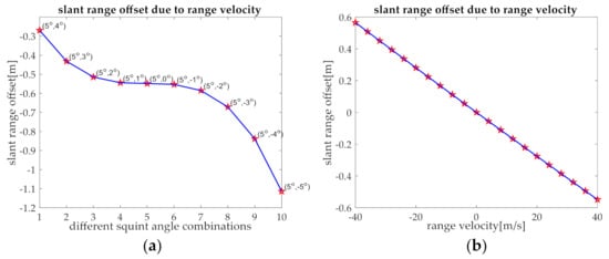 Except for azimuth position offset, the mismatch of Doppler spectrum also causes extra slant range offset as in Equation (10). The slant range offset between acquisitions of squint angle and is