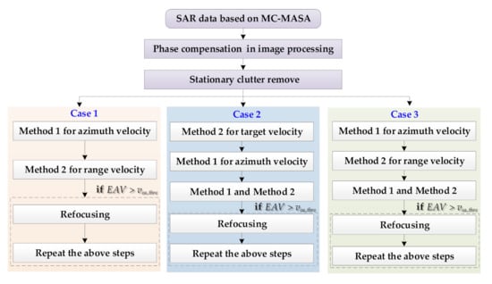 In order to extract more information of moving targets, the stationary clutter is removed firstly for all acquisitions. As both method 1 and method 2 are based on two acquisitions, only two images with squint angle and are analyzed in the following cases. In addition, the relationship of squint angles is an important factor for velocity estimation. Therefore, different cases are discussed, with different corresponding processes.