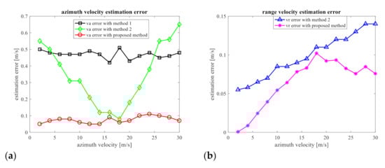 Velocity estimation error in both azimuth and range directions with different methods. Azimuth velocity varies from 2 to 30 m/s and range velocity is 30 m/s: (a) Azimuth velocity estimation error; (b) Range velocity estimation error.