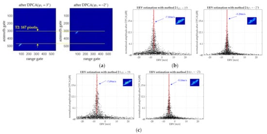The estimation for T2 expands on the result of T1 by adding a refocusing process. The images of T2 with DPCA processing before refocusing is given in Figure 11a. Based on the ERV estimation results of T2 shown in Figure 11b, the EAV is obtained as −20.56 m/s for and −21.12 m/s for . As the EAV results of both images are greater than , refocusing is implemented and the interferometric result is shown in Figure 11c. The target images on Figure 11b,c also illustrate that after refocusing, the target outline becomes clearer which is valuable for method 1 and azimuth offset changes to 166 pixels. However, for the extended target, the improvement of SCR is small as the total energy is constant, only about 0.1 dB. With the estimation process for Case 2, the final estimated velocity of T2 is before refocusing and after refocusing. The velocity error is reduced by 0.03 m/s and 0.13 m/s along range and azimuth directions, respectively.